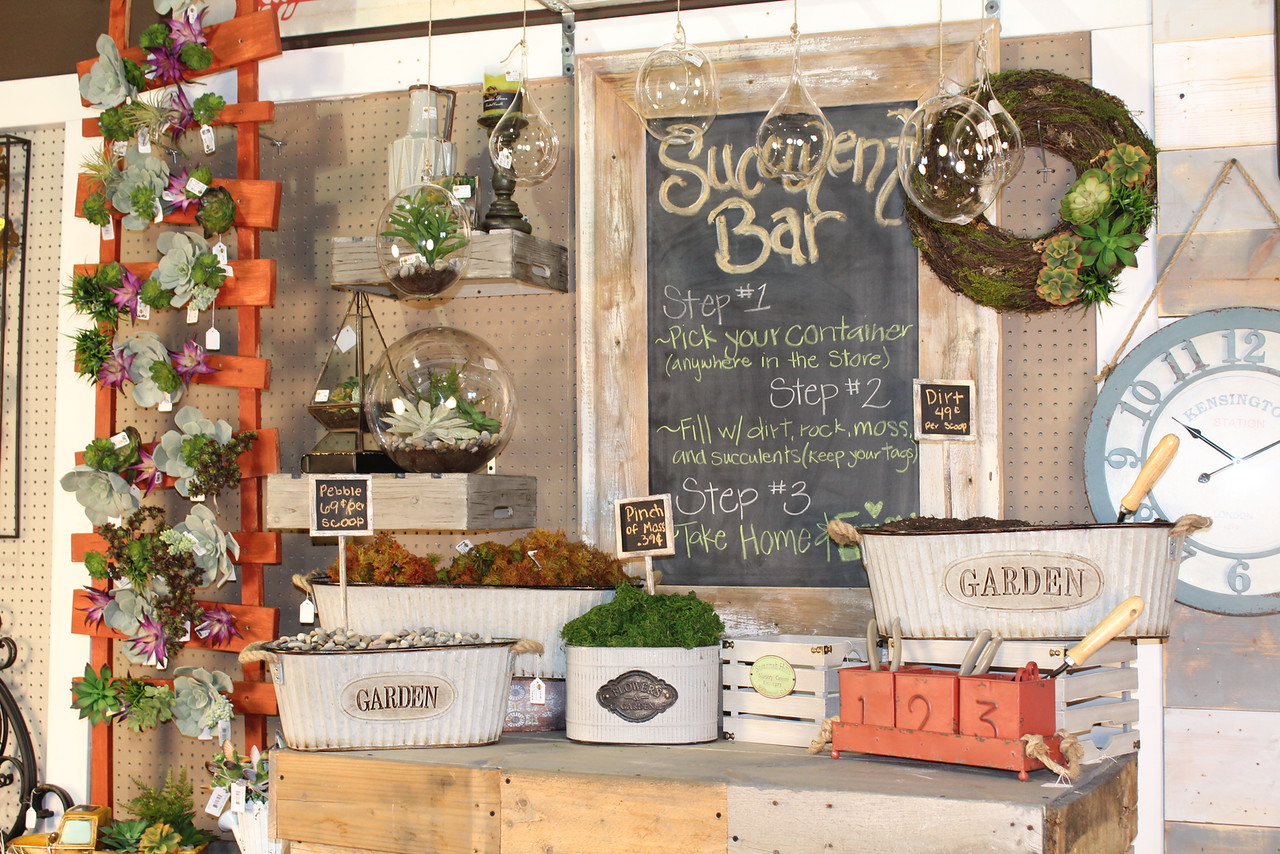Here at Real Deals’ Succulent Bar (yes, you heard us right, Succulent Bar baby), you and your children can scoop your own dirt or pebbles and place your own decorations in a variety of containers — from hanging bulb terrariums to geometric metallic glass containers. We’ve had customers use natural materials and succulents (in pale greens all the way to vibrant purples) to create amazing contemporary looks, but sometimes a fairy may even charm her way into serious terrariums. And we think that’s pretty cool.